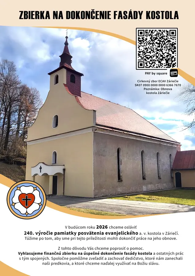 V budúcom roku 2026 chceme osláviť 240. výročie pamiatky posvätenia evanjelického a. v. kostola v Záriečí. Túžime po tom, aby sme pri tejto príležitosti mohli dokončiť práce na jeho obnove.