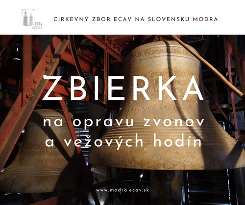 Cirkevný zbor ECAV na Slovensku Modra vyhlasuje zbierku na opravu zvonov a vežových hodín na slovenskom evanjelickom kostole ap. Petra a Pavla v Modre. Napriek snahe o ich prevádzku a údržbu je potrebná komplexná oprava. Preto sa na Vás obraciame s prosbou o finančnú podporu na ich opravu.